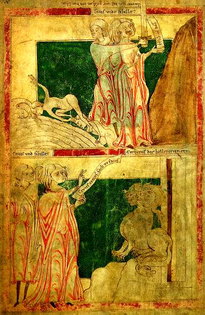 23v. oben: Eneas und Sibylle erreichen den Fluß Lethe, das Schwert des Eneas dient als Fackel